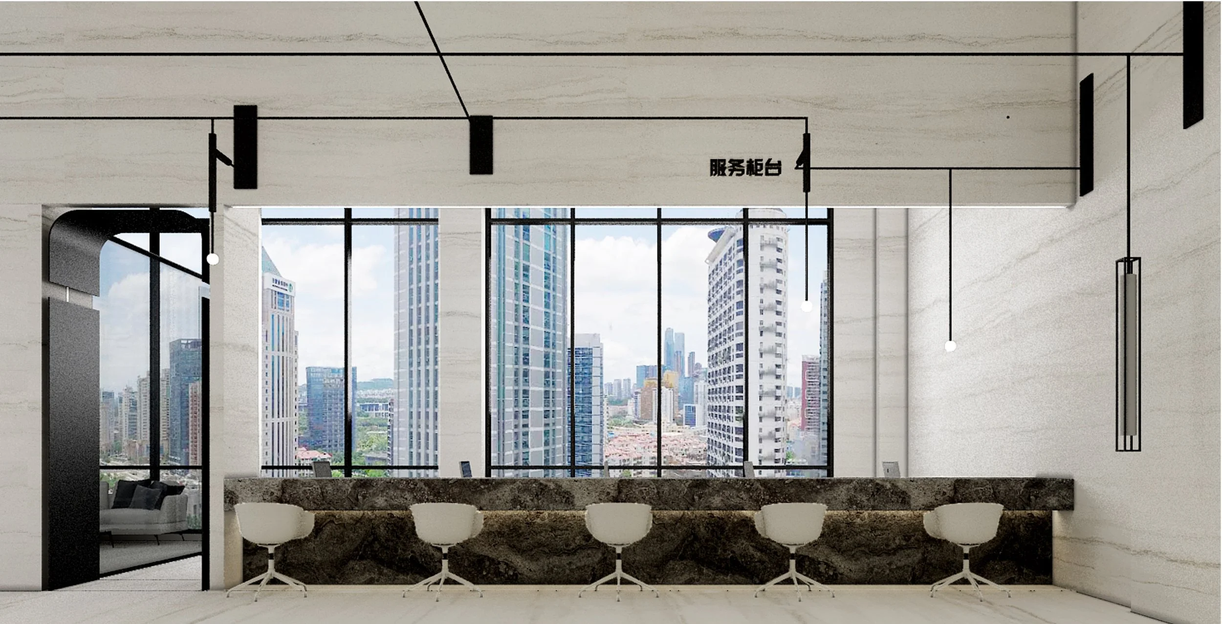 Given the 5-meter ceiling height in the public areas, I used black lines to highlight the geometric structure within a predominantly light-toned stone space. Lighting fixtures were integrated with these black metal lines, creating a dramatic interplay of light and shadow that enhanced the space's sense of scale and precision.