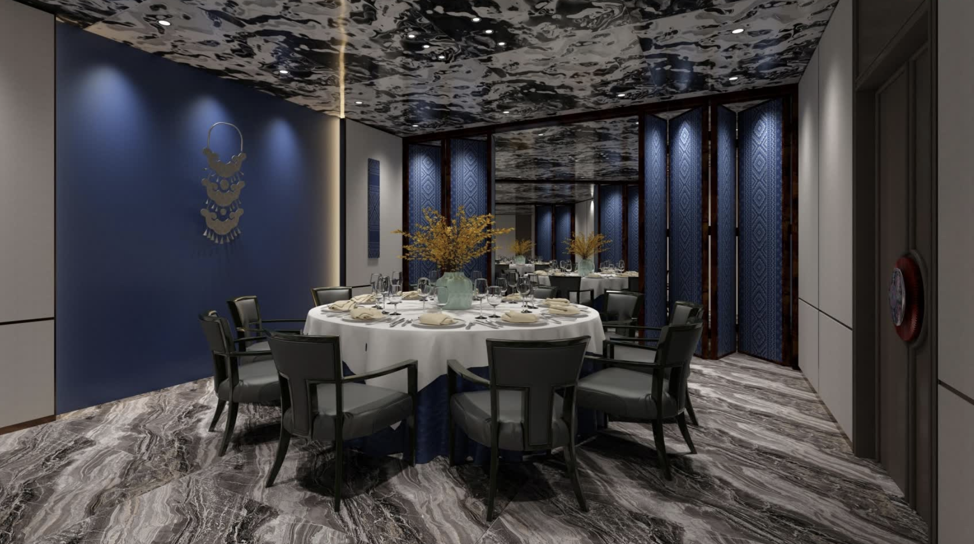 A 2,100 m² restaurant dedicated to Qiandongnan Dong cuisine has been completed, celebrating the region’s culinary and cultural heritage. It comprises twenty-eight private dining rooms, management offices, storage areas, and a 250 m² back-of-house kitchen. I created an environment that honored Dong identity: layered timber “wind-and-rain” bridge motifs, indigo batik patterns, and bronze drum rhythms were woven into a contemporary dining experience firmly rooted in Guizhou.